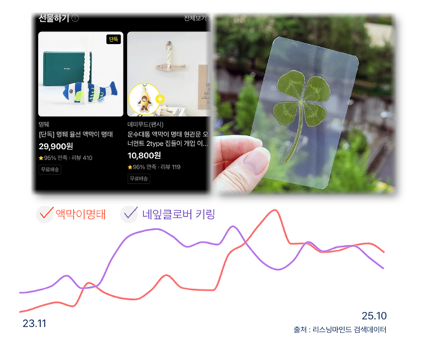 최근 ‘액막이 명태’, ‘네잎클로버 키링’과 같은 무속 연관 굿즈 키워드도 뚜렷한 상승 흐름을 보인다.
