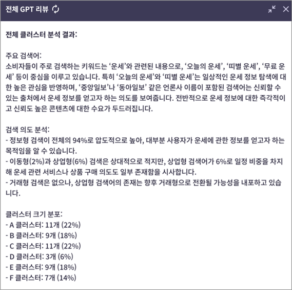 리스닝마인드의 GPT 기능은 검색 데이터를 요약하고, 그 안에서 인사이트를 정리하며, 추가로 던질 만한 질문까지 제안해준다. 기획서 작성 과정에서 막히는 지점을 정리해 주는 조력자에 가까웠고, 데이터 활용의 허들을 한 단계 더 낮춰주는 역할을 했다.