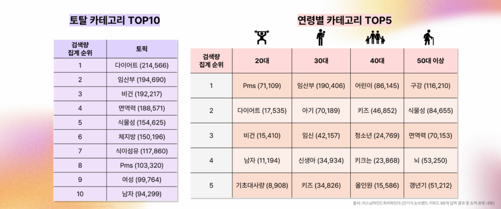 건강기능식품 시장은 더 이상 단순한 영양 보충 개념을 넘어 소비자의 생애주기·라이프스타일·가족 구조 변화와 밀접하게 연결된 목적형 소비 시장으로 빠르게 진화하고 있다. 연령대별로 달라지는 건강 고민과 제품 탐색 패턴을 이해하는 것은 브랜드 전략, 제품 기획, 마케팅 메시지 설계에 핵심적인 인사이트가 되며, 이를 검색 데이터를 활용해 발견할 수 있다.