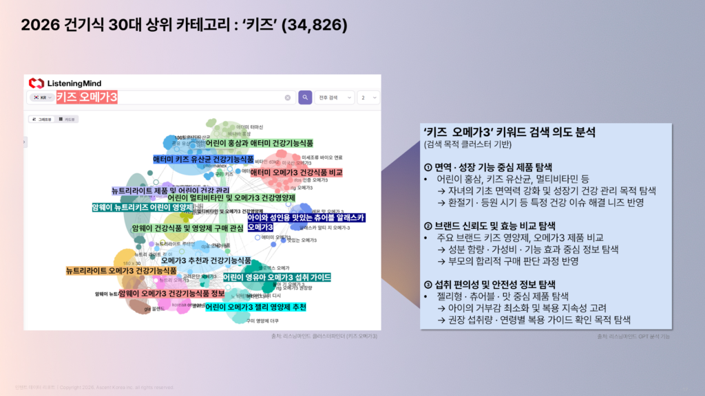 30대 건기식 상위 카테고리: ‘키즈’ (자녀)대상 건강관리에 대한 실질적 해결책을 탐색