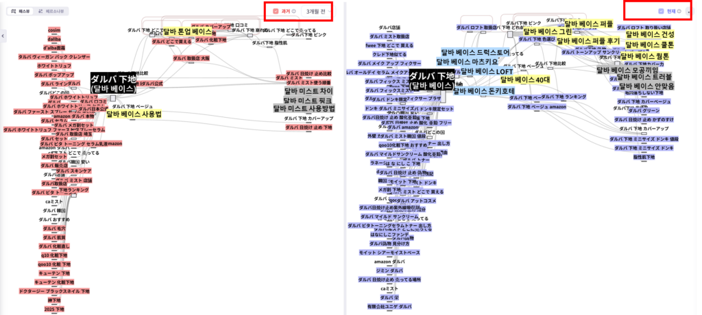‘달바 메이크업 베이스(ダルバ 下地)’의 검색량이 본격적으로 증가하기 시작한 3개월 전과 현재를 비교해보면, 검색 니즈가 더욱 다양하고 구체적으로 심화되고 있음을 확인할 수 있습니다.