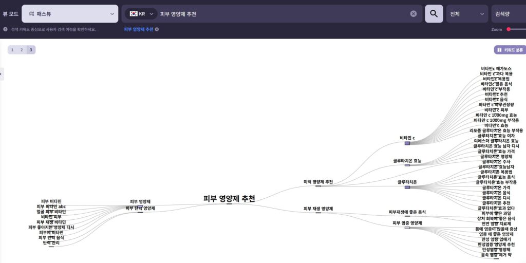 위 데이터는 ‘피부 영양제 추천’을 검색하는 소비자들의 검색 경로를 나타내고 있다. 해당 키워드(추천)을 검색하기 이전에는, ‘피부 비타민’, ‘피부 좋아지는 영양제’, ‘피부 탄력 음식’, ‘탄력 관리’ 등 기존에 잠재되어 있는 니즈를 담고 있으며, 이후에는 본격적으로 ‘추천’을 넘어서 ‘비타민 C’, ‘글루타치온’, ‘피부 염증 영양제’ 등으로 각각 검색 경로가 새로 형성되어 있는 흐름을 나타낸다. 이후 ‘효능’ 및 ‘과다복용’, ‘부작용’, ‘효과 없음’ 등을 검색하는 맥락이 발견된다.