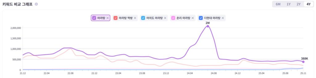 아래는 ‘마라탕’ 키워드의 최근 4년간 검색량 추이를 나타내는 데이터로, 24년 7월 급증한 검색량(2,079,800회)을 보인 후, 최근 1년간 하락 이후 기준선 변화를 유지하고 있는 흐름을 확인할 수 있다.