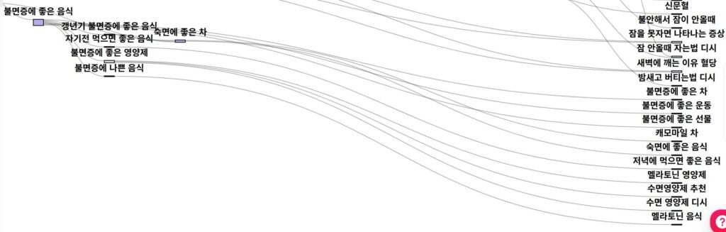 다음으로 ‘잠 안오는 이유’ 검색 경로를 오른쪽으로 확장해보면 ‘구매 탐색 의도’가 담긴 키워드를 발견할 수 있다. (ex. 갱년기 불면증에 좋은 음식, 불면증에 좋은 영양제, 캐모마일 차, 멜라토닌 영양제, 수면영양제 추천 등)