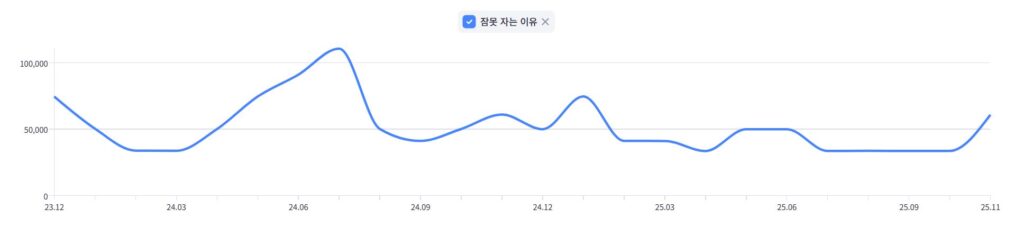위와 같이 최근에 검색량이 증가한 ‘잠 못자는 이유(월 평균 검색량 42,650회)’ 키워드의 경우, YoY 기준으로 보았을 때 전반적으로 증감을 반복하지만 분명 급증하는 시기가 발견된다. (24년 4월, 24년 10월, 11월, 25년 4월, 11월 등) 해당 흐름을 파악해, 검색량 곡선에 맞춘 콘텐츠 유형도 달라질 수 있다.